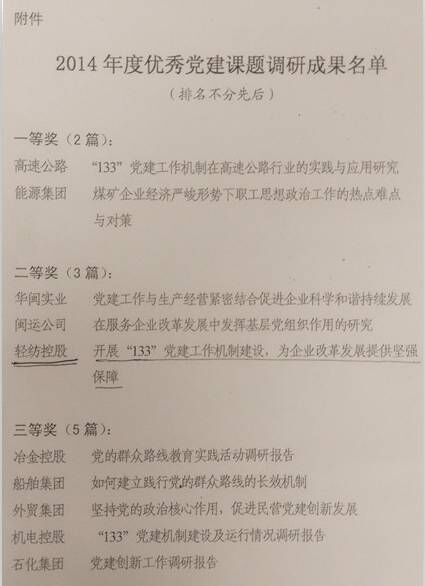 根據(jù)閩國資黨委〔2015〕56號(hào)文件通知,公司2014年度黨建調(diào)研課題《開展“