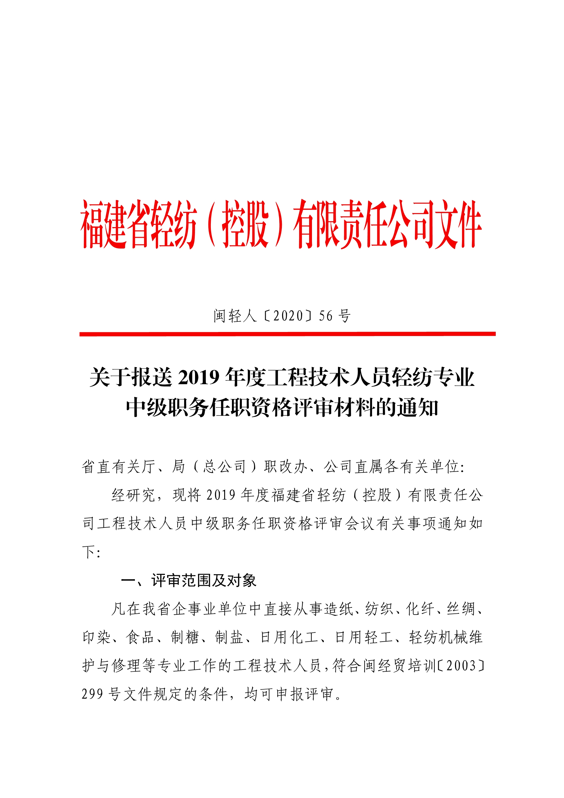 關(guān)于報(bào)送 2019 年度工程技術(shù)人員輕紡專業(yè)中級(jí)職務(wù)任職資格評(píng)審材料的通知