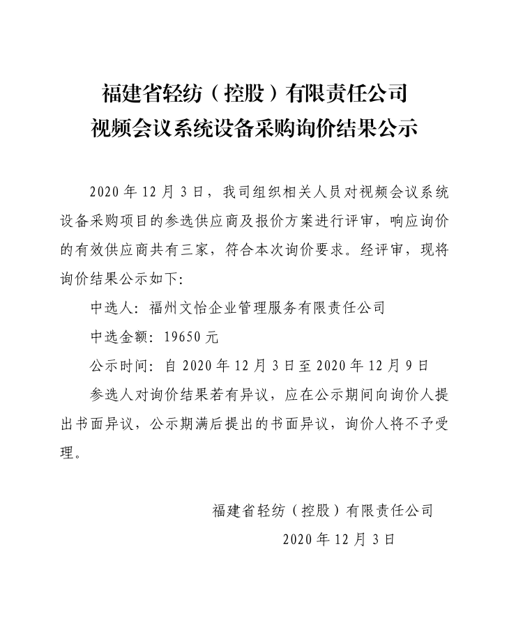 福建輕紡視頻會(huì)議系統(tǒng)設(shè)備采購詢價(jià)結(jié)果公示