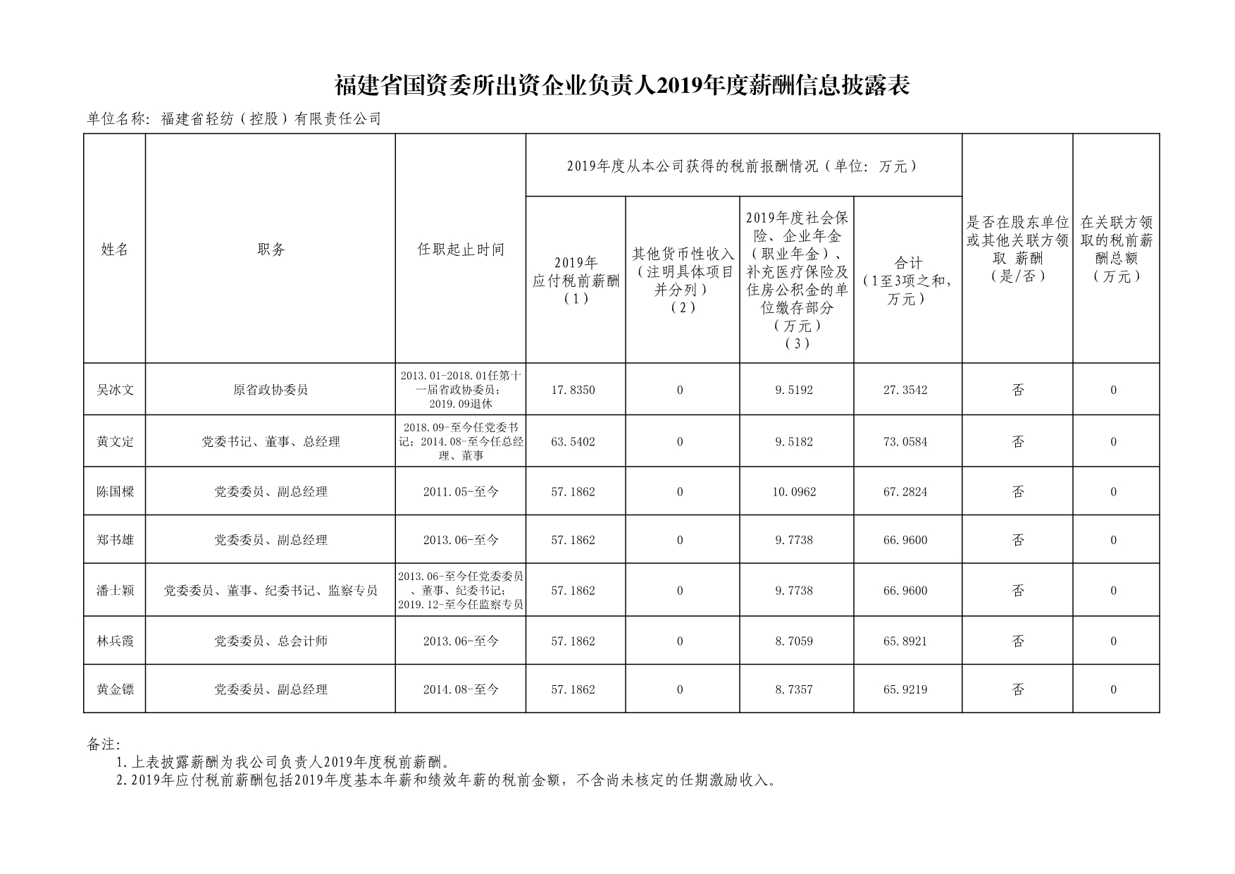 福建省國資委所出資企業(yè)負(fù)責(zé)人2019年度薪酬信息披露表